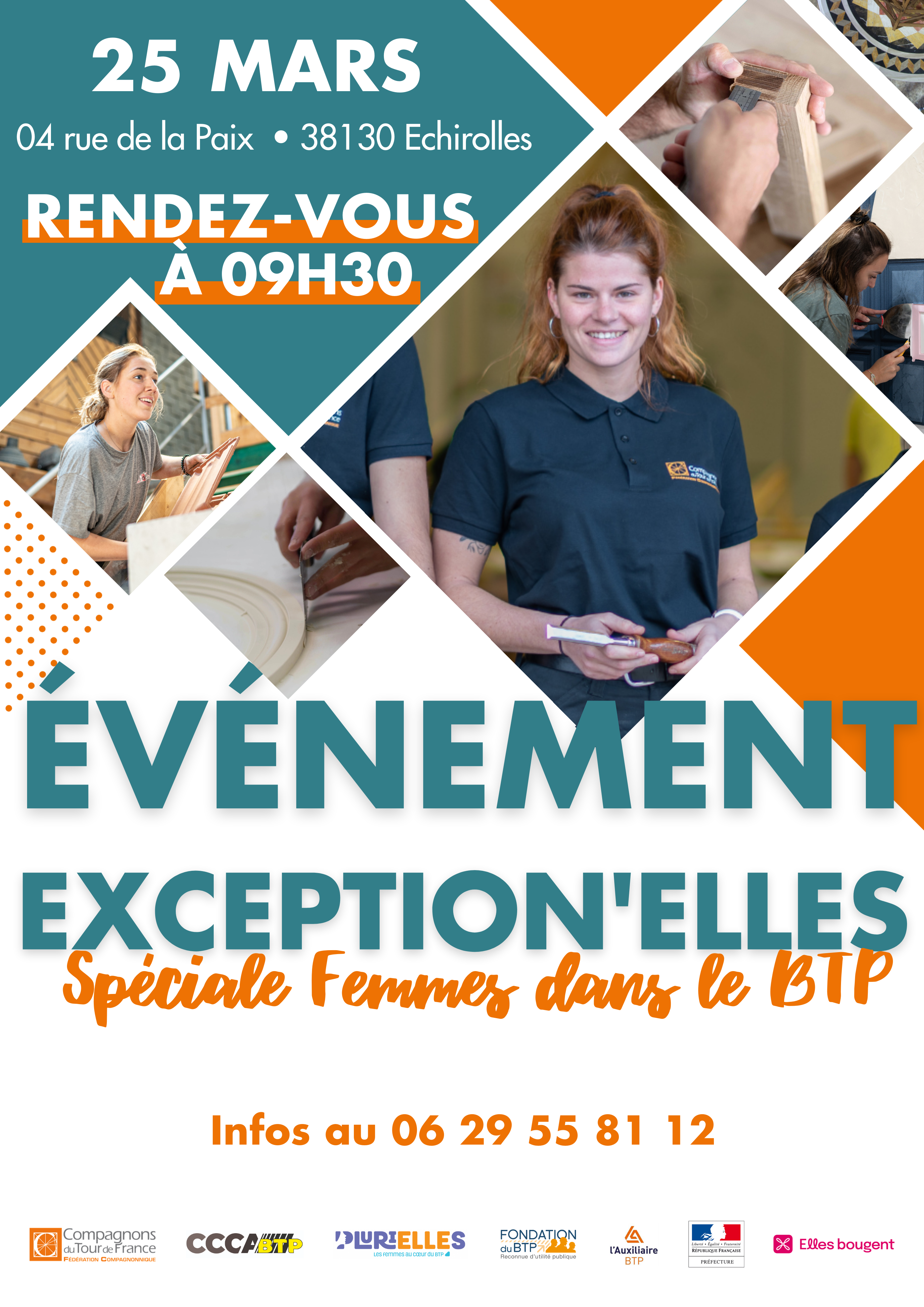 Nouveaux rendez-vous "Exception'ELLEs"! Les équipes des Compagnons du Tour de France Echirolles vous proposent des ateliers dans le cadre de l'immersion professionnelle, des rendez-vous avec les métiers du BTP.