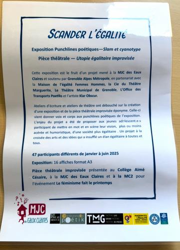 Cette exposition est le fruit d'un projet mené à la MJC des Eaux Claires et soutenu par Grenoble Alpes Métropole, en partenariat avec la maison pour l'égalité femmes hommes, la cie du théâtre Marguerite, le théâtre municipale de Grenoble, l'office des transports poetiks et l'artiste Klar Obscur. Elle scande l'égalité des genres et a été transformée en pièce théâtrale d'impro pour le Féminisme fait le printemps en GRAND.